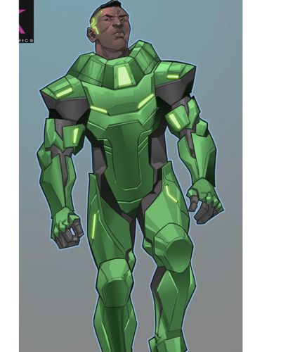 BRANE’S abilities: Superhumanoid brute powers. Can crush rocks or any hard surface with his fist. Can leap long distances. Fly in his suit. Can breathe in space. Beam lasers of green light from his eyes.